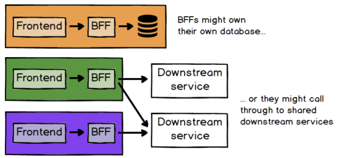 - BFF(Backend for Frontend Pattern) 패턴으로 프론트앤드 전용 API를 갖는다. 각 마이크로 앱들은 해당 프론트 엔드의 요구사항만 충족하는 목적을 가진 백엔드만을 가진다.