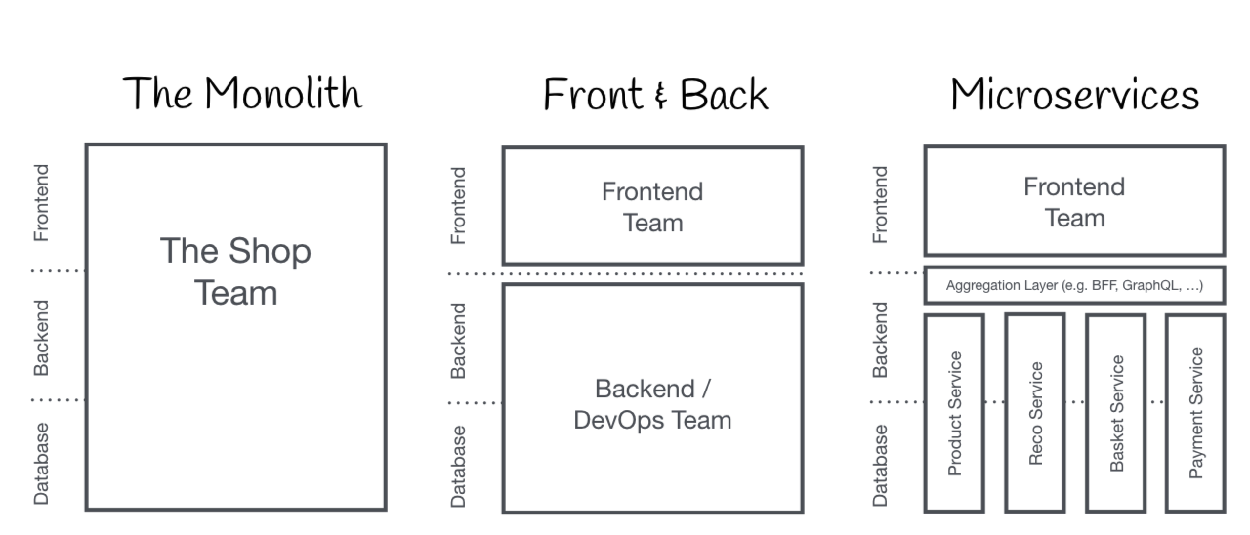 - 마이크로 프런트 엔드는 수직 팀을 장려한다. 수직 팀에는 일반적으로 기능 소유자, UX 디자이너, 제품 관리자, 백엔드 개발자, 프런트 엔드 개발자 및 품질 보증 엔지니어가 포함된다.